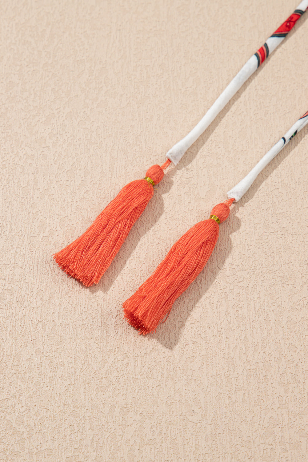 Delicate lace detail at sleeves and tassel tie of the neck.