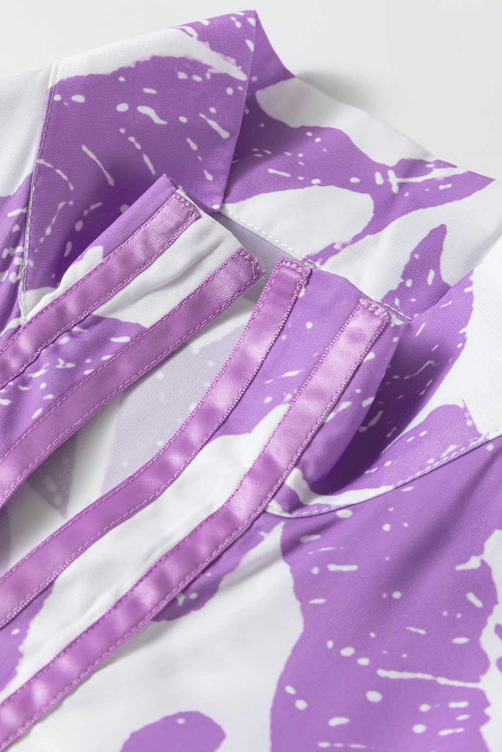 Purple Leafy Print 3/4 Sleeve Striped Trim Split Neck Blouse