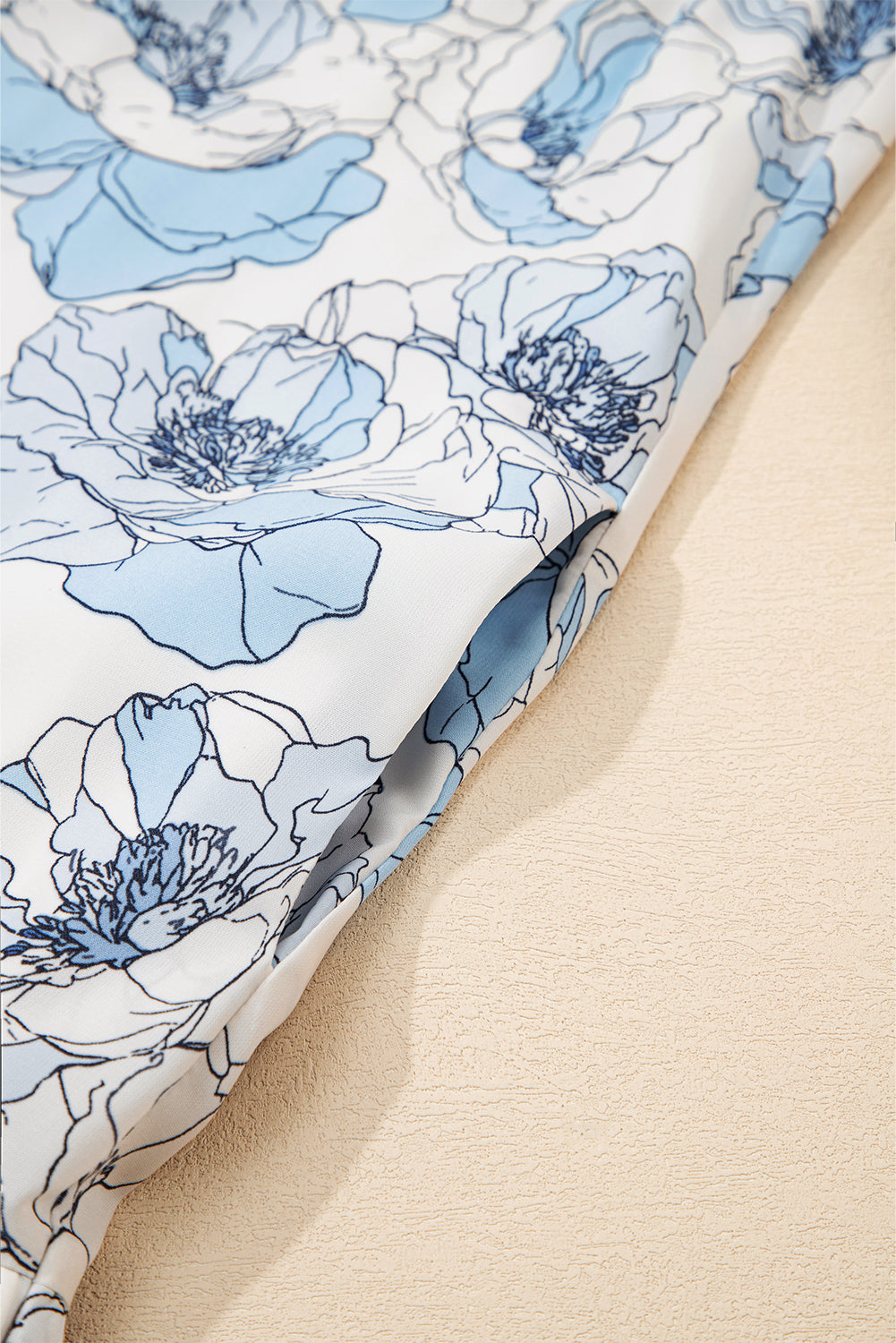 Sky Blue Floral Print Tie Neck Long Sleeve Flowy Mini Dress