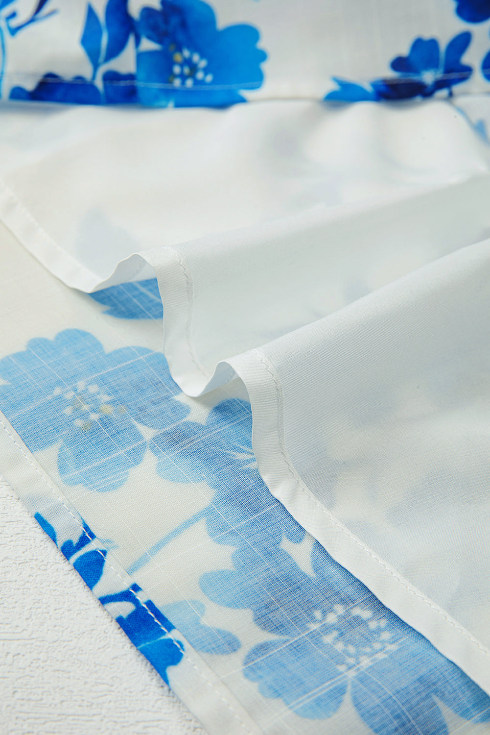 Blue Floral Long Sleeve Lace-up V Neck Blouse