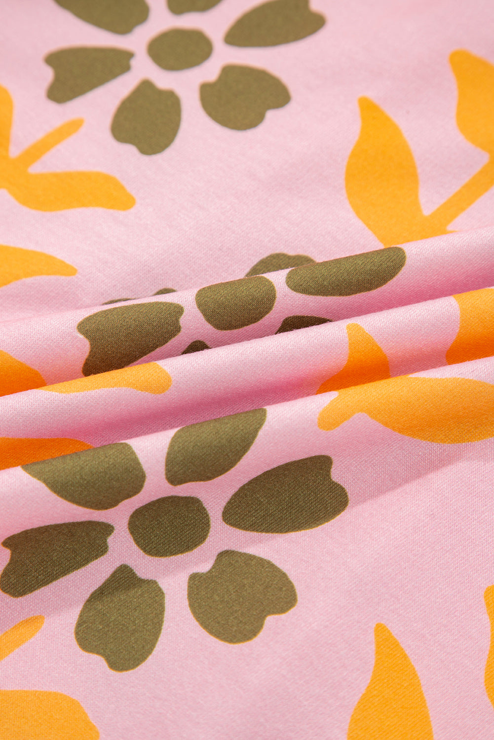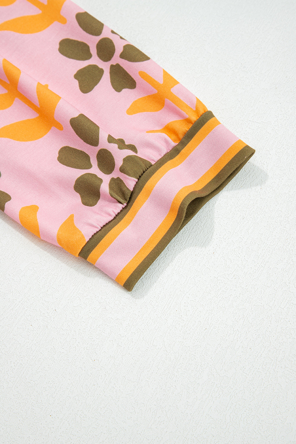 Pink Floral Print Zip Neck Striped Patchwork Long Sleeve Drawstring Dress