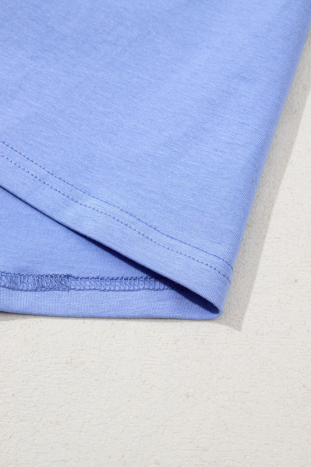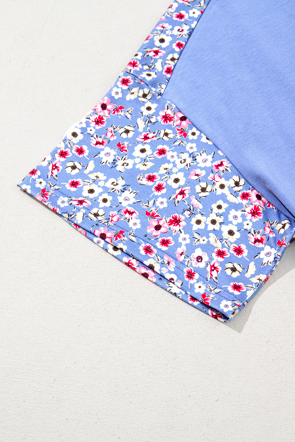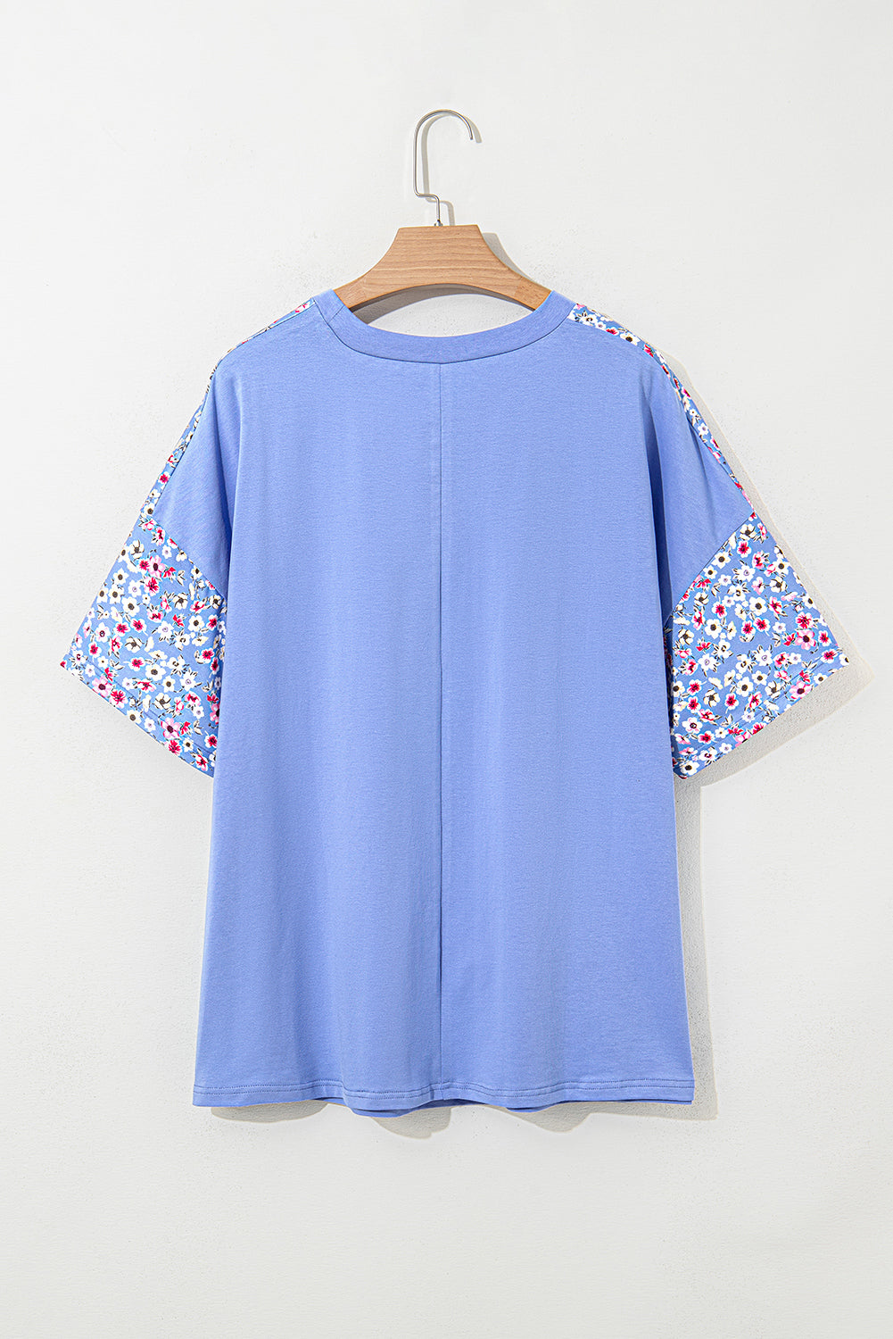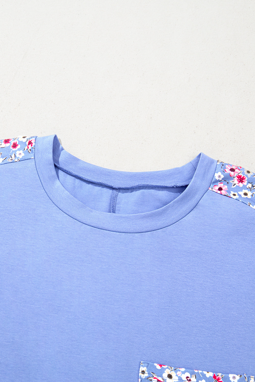 Sky Blue Floral Patchwork Chest Pocket Crewneck Plus Size T Shirt