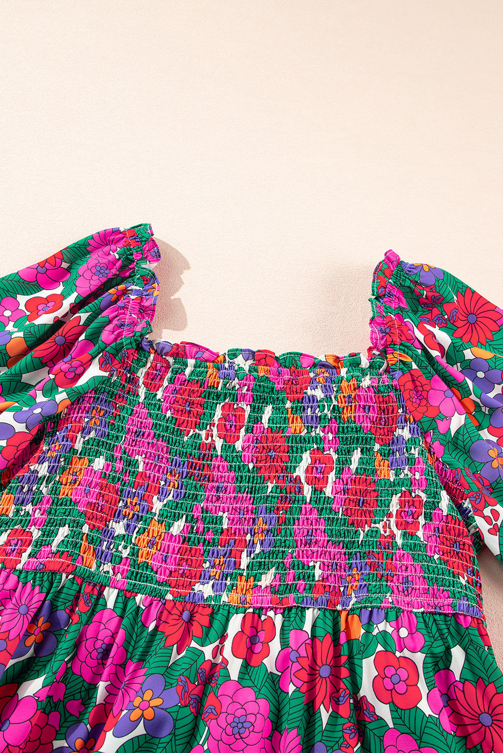 White Plus Size Floral Frilled Square Neck Shirred Long Sleeve Dress